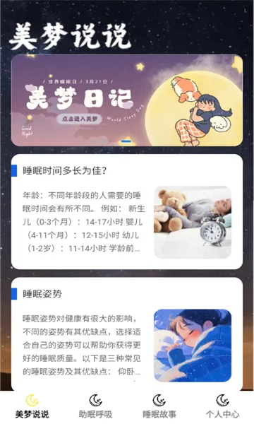 2、提供多样助眠方式,如听故事、语音引导呼吸等,放松心情助入眠。