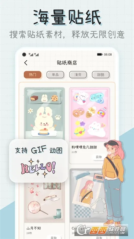 2. 海量素材:内置大量精美贴纸、个性化模板、便利贴等,用户可根据喜好自由搭配,还有原创新颖可爱的手帐贴纸、精美背景模板、画笔素材免费持续更新。