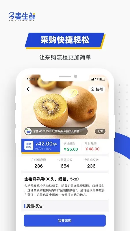 多麦生鲜是专注生鲜批发的采购软件,服务水果经销商等B端用户。汇聚超1000家供应商,提供百余种精选水果与生鲜。有实时行情、便捷采购、冷链配送等服务,还有多种特色功能与优势,是可靠的采购助手。