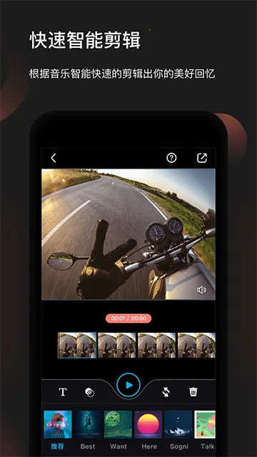 3. 具备剪辑工具,有智能快速剪辑,能自动筛选、节奏匹配模板风格,也有专业时间轴编辑,可进行视频裁剪、分割、拼接,添加音乐、音效、字幕、文字、贴图与滤镜特效,最后导出分享。