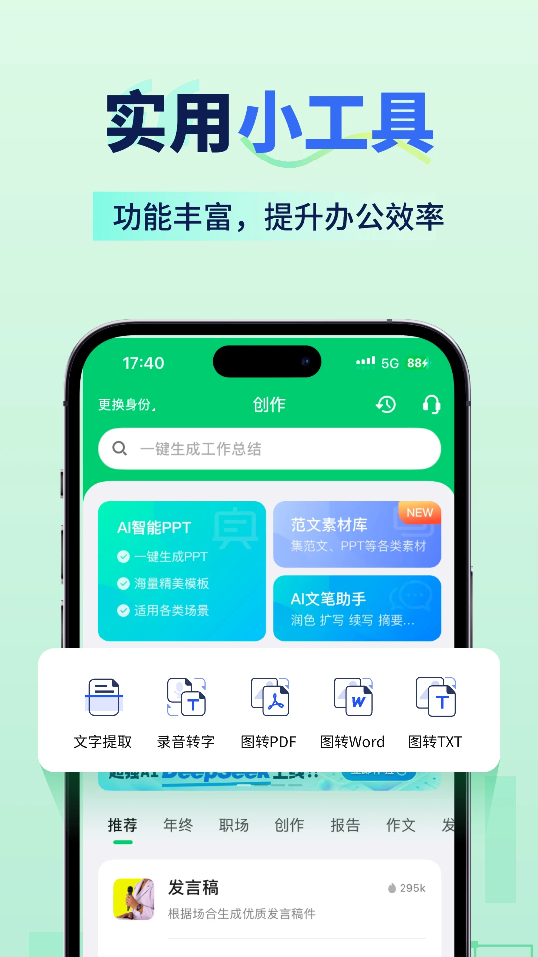 1、内置300定制化写作模板,覆盖办公文档、学习材料、生活文案、商业内容四大类场景,输入主题关键信息,一键生成结构完整、逻辑清晰的文本。