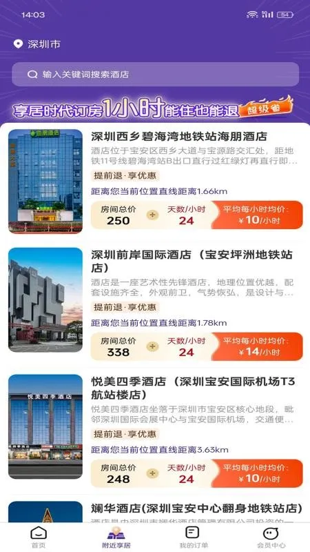 享居时代app是分时酒店预订平台,按小时计费。能依定位推周边酒店,提供丰富信息助选性价比高的。有周边酒店、酒店查找等功能,特色是省钱、优惠多、海量酒店、费用透明,助用户轻松找优质省钱酒店。