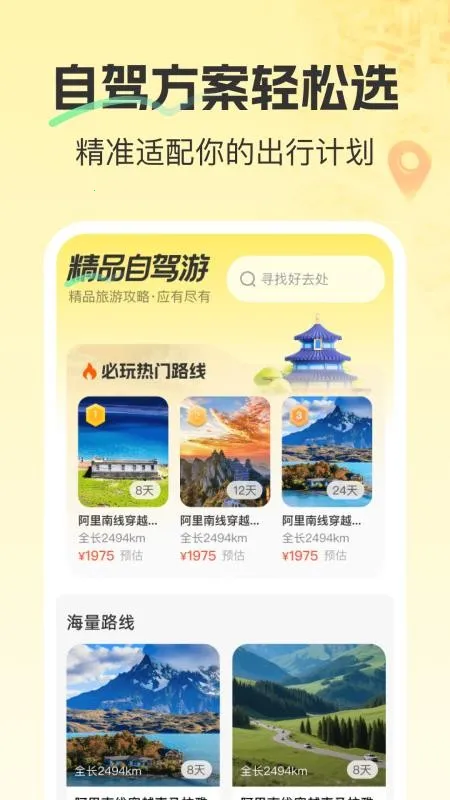2、提供丰富自驾路线与海量自驾方案,精准适配出行计划,让出行更便捷。