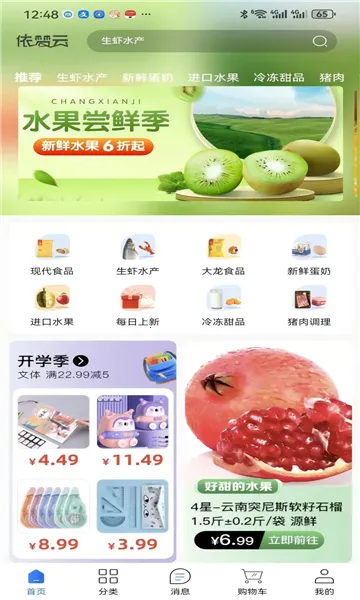 依梦云是一款自由生活购物类app,用户能在此购买各类货物,涵盖现代食物、水产蛋奶等。商家24小时在线处理订单,商品范围广,有积分换礼、水果尝鲜季优惠等。商品信息正版,售后完善,优惠券限时,购物体验良好。