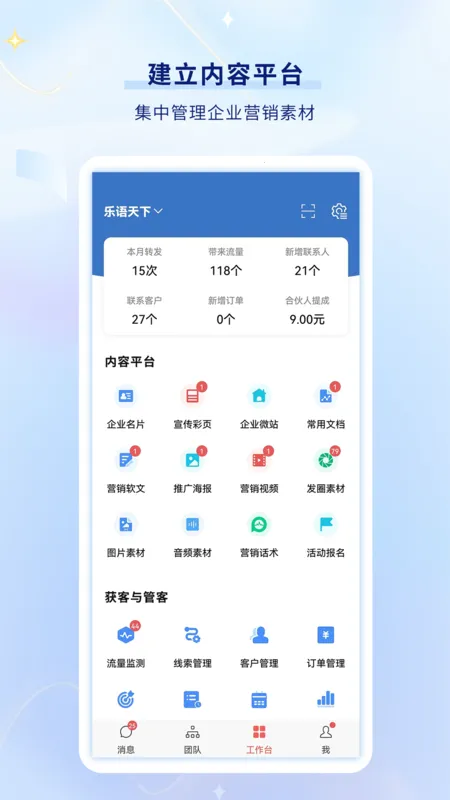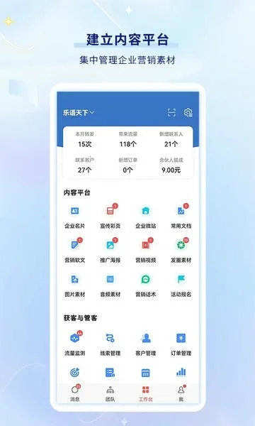 乐语是一款超棒的企业运营管理软件,能满足你的多种需求。它有快速撰写带广告营销软文并一键分享到社交网络的功能,还能管理会员卡积分和分销提现。一键备份手机通讯录,给好友分类或添加图文备忘录也很方便,收藏喜欢的手机网站或商城,实现一键打开与分享,转发软文还能自动带广告。它能解决企业运营管理中的诸多问题,比如高效管理客户资源,提升品牌曝光度。通过集成获客、管客、养客等核心功能,帮你轻松监控私域流量,快速了解客户需求,增强与客户互动关系。制定科学考核体系,配备KPI考核系统,管理者能控制运营过程,财务人员可评估营销岗位绩效。界面友好还能个性化设置,不管是移动营销活动,还是分享电子名片与宣传资料,乐语都能满足,快来下载开启智能化运营管理之旅吧!