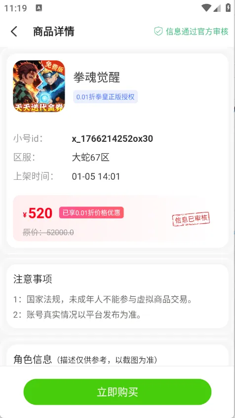 传说折扣游戏号是一款超棒的在线游戏账号交易软件。这里有超多卖家和买家,且都需实名认证,能大大降低交易风险,保障大家利益。它有多样游戏资源,可通过平台购买。软件特色满满,交易中账户有安全问题,平台提供官方补偿;专业客服全天在线,纠纷问题轻松解决。亮点也不少,整合大量游戏账号资源,各能力段用户都能找到要玩的游戏,还不定期发放优惠折扣,省钱超划算。用法简单,闲置游戏账户能一键上架出售,付款到账全程有平台监护,资金安全无忧。还能按游戏类型精准查找购买资源。小编点评,账户上架后平台精心审核,确保资源真实,还能提前试玩未上线游戏。想交易游戏账号、获取多样游戏资源,传说折扣游戏号绝对是个不错的选择。