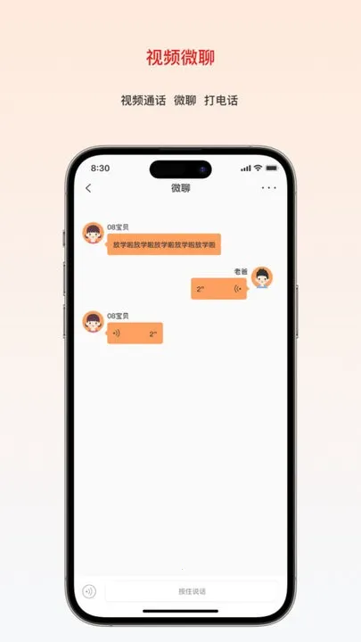 3. 便捷交互:首次使用几步操作就能快速完成手机与儿童手表绑定,首页集中呈现关键信息。支持高清语音通话与双向视频通话,画质清晰延迟低,拉近亲子距离。