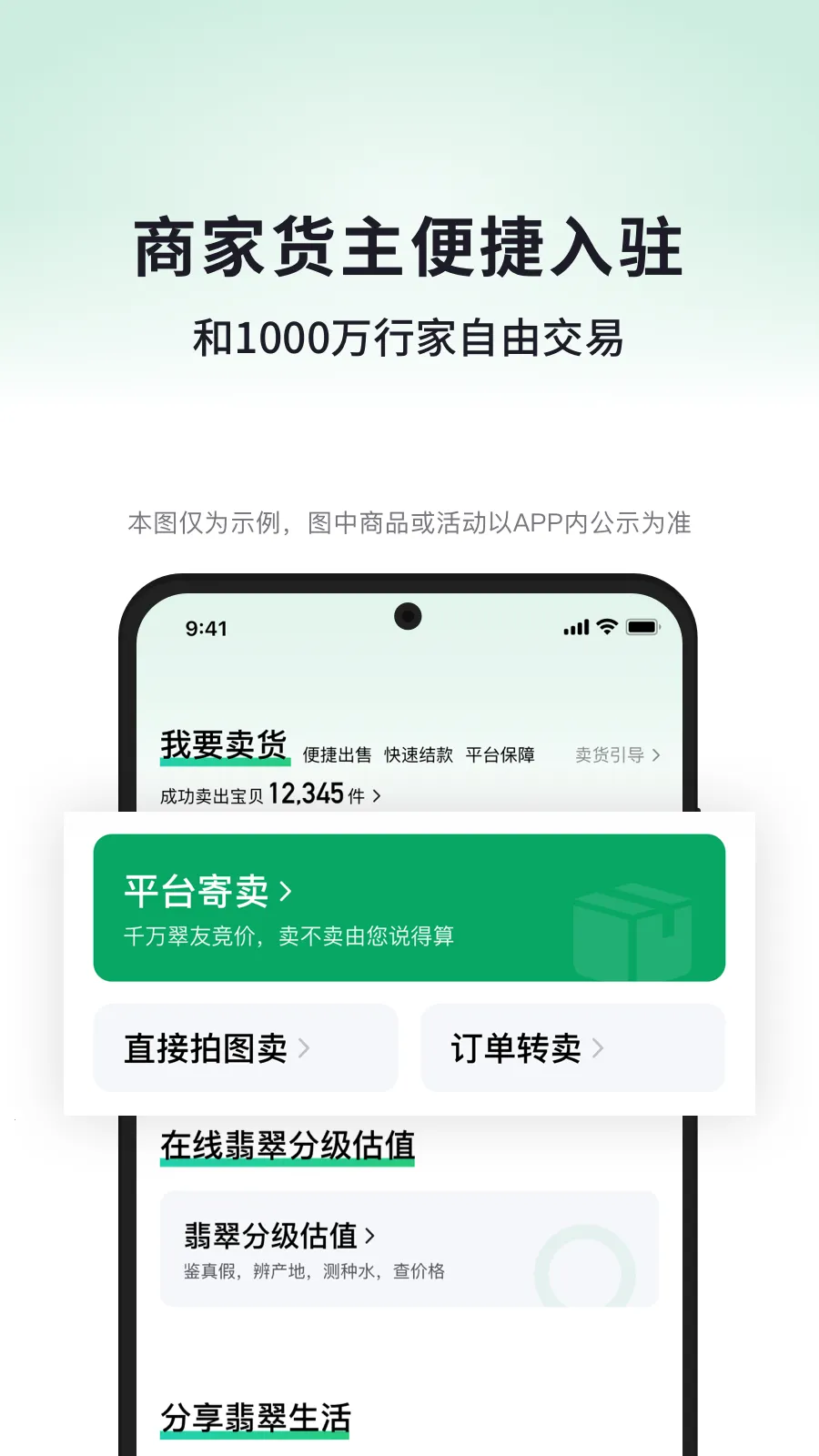 3. 多种交易方式:支持拍卖交易,精品宝贝每日0元起拍,参与出价还可赚红包;支持寄售,符各平台寄售标准即可寄出;支持移动店铺经营,创建账号可生成专属店铺,APP、微信、微博、QQ空间通用,还能一键转售商品,零库存卖精品翡翠。