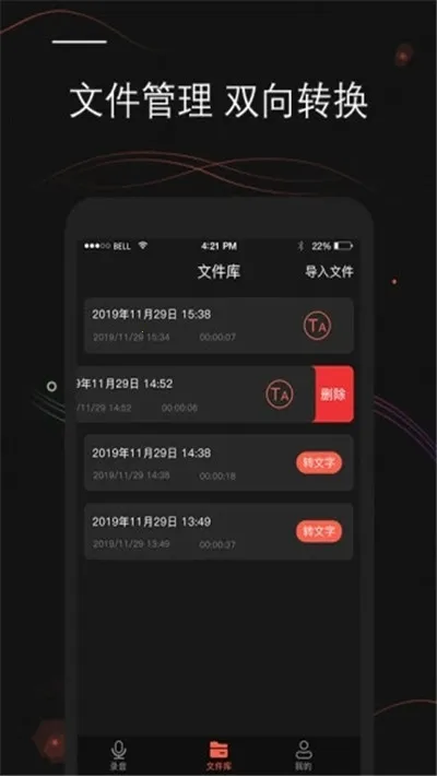 录音文字转换app是一款多功能软件,支持录音转文字、在线翻译、音频剪切、文字合成配音等。采用智能语音识别技术,准确率高速度快,支持多格式转写,能满足各人群语音转文字、文字转语音需求,还可保存文件、自定义设置。