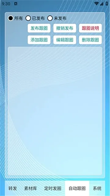 定时自动发圈是一款智能发圈工具,专为社交媒体用户打造。支持文字、图文、链接定时发布,操作简便。有丰富模板,能跟踪转发好友圈,一键批量设置,全自动发圈。还可下载素材、管理素材库,多类型定时发圈,实现统一云控管理。