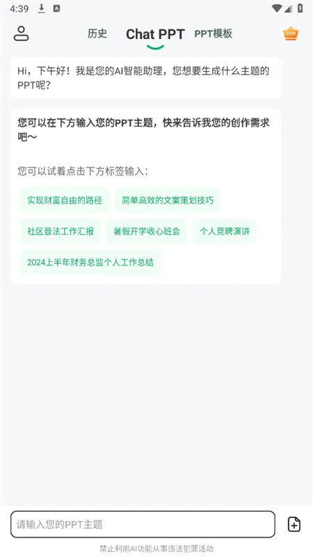 ChatPPT安卓版是功能强大的智能PPT制作软件,界面简洁操作易。输入主题需求就能快速生成内容,有海量模板涵盖多场景。支持跨平台,能智能生成、推荐模板,还可自定义配色排版,高效安全,满足多样办公需求。