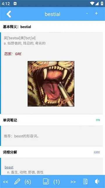 想批量背单词?这款词根词缀字典神器可帮大忙啦!它能充分利用单词构词规律,通过掌握共同词根词缀,实现成串记忆单词。这里总结了大量词根和包含词根的单词,还有正向和反向索引,方便举一反三查询。它会标记各类英语考试常考词汇,像四六级、专四专八、考研,以及托福、雅思、GRE等,让你有的放矢复习。有多种创新记忆方式,比如谐音、图像联想、对比记忆等,让背单词不再枯燥。还能选择性隐藏词组和专业词汇,加速找目标词。有护眼模式,保护眼睛。提供生词本,可按多种方式排序显示。更有单词逆序检索功能,方便查找特定结尾的词汇。有了它,批量背单词超轻松,英语学习效率大大提高,助你在各类考试中轻松过关!