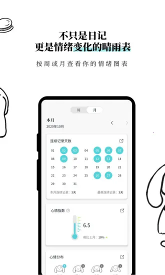 3、引导式设计贴心,让写日记不再困难,轻松上手。而且它不仅是日记本,更是情绪变化晴雨表,自动整理,方便查看情绪图表和活动统计。