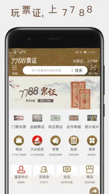 7788票证是专业票证收藏鉴定投资加价交易平台,1999年成立。商品种类丰富,有八千万件,近十万商家、百万买家。提供多种交易模式,支持鉴定,APP功能便捷,新版有扫一扫、相册传图优化等特性。