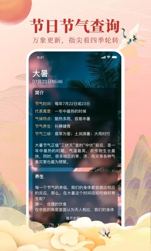 全民万年历是便捷生活服务软件,免费提供万年历、黄历、农历等,有天气查询、节日节气、择吉日等功能,还能日程提醒、个性阅读。界面简洁,功能实用,多种主题皮肤和壁纸,不断优化性能提升体验。