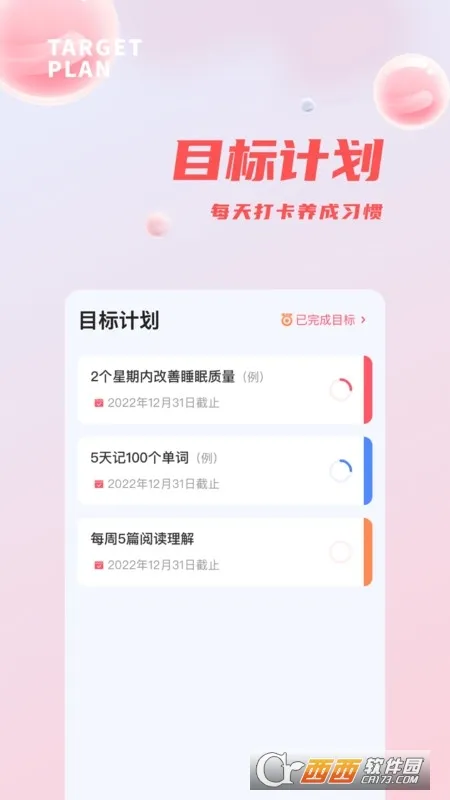 4. 目标进度量化:制定宏观目标后,可设置小任务,以丰富样式展示进度