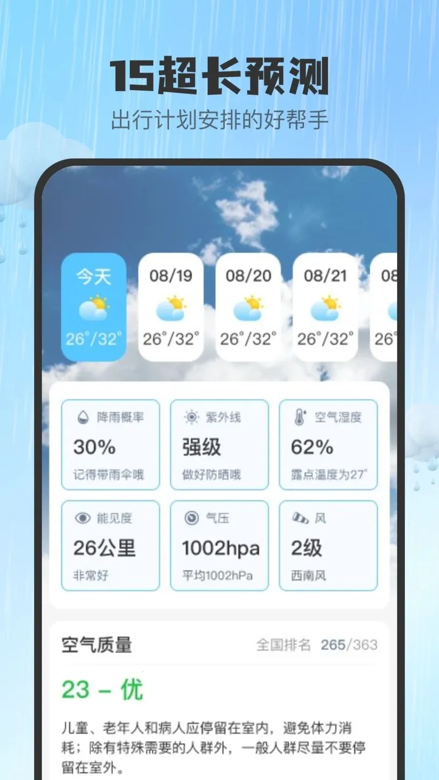 2、提供15日天气预测,方便提前规划出行安排,出行快人一步。