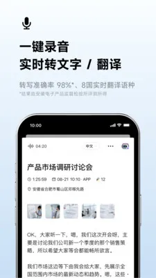 1、一键录音,实时实现语音转文字与语音翻译,24种语言自由转写,8国语言随心互译。