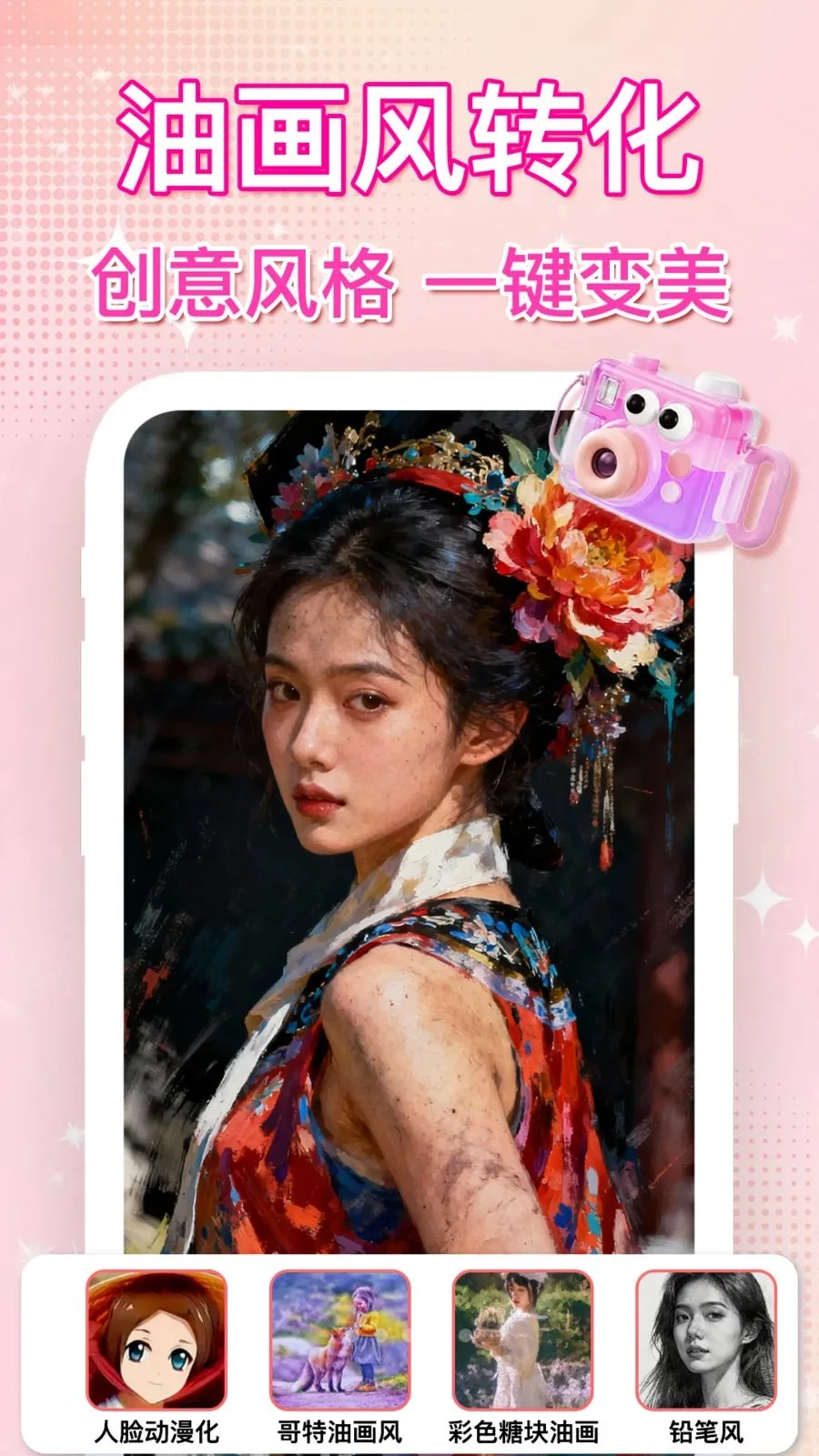 1、AI风格转化,多彩相片人脸动漫化、油画风、铅笔风等多种创意风格随心切换,一键生成专属艺术大片。