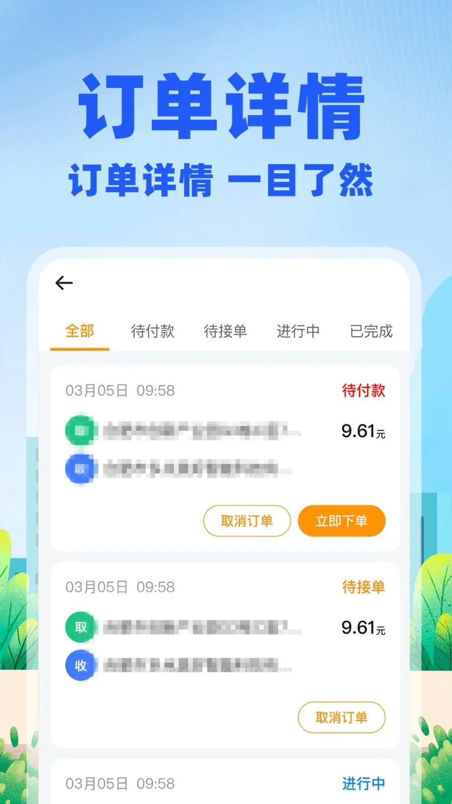 1、一键轻松下单,操作便捷无需繁琐步骤,百万实名认证骑手在线待命,极速响应需求,高效解决同城即时配送难题。