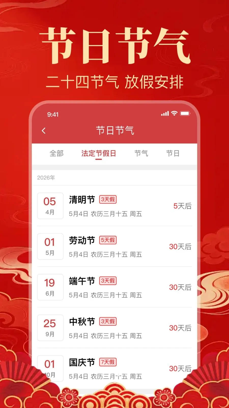 1、每日完整老黄历详情,清晰标注宜忌事项,覆盖婚嫁、乔迁、开业等全场景需求。