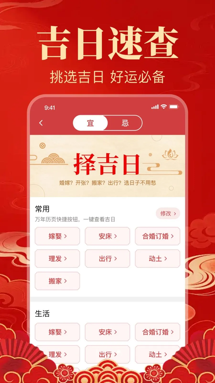 4、拥有专属吉日检索功能,自定义场景查吉日,婚嫁、乔迁等选日不踩坑。