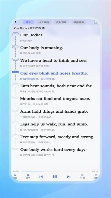 3、智能纠音搭配标准纯正音频,支持中英对照与逐句跟读,定位底层发音弱点,提升语言自信。