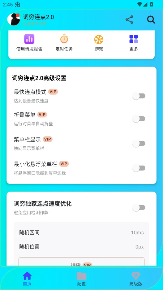词穷连点2.0是一款为安卓手机打造的免费点击器软件。经底层优化,兼容性强。能高精度模拟手动操作,支持单点、多点等多种点击模式及滑动手势。具备良好任务管理能力,操作简单,功能全面,可解放双手,值得一试。