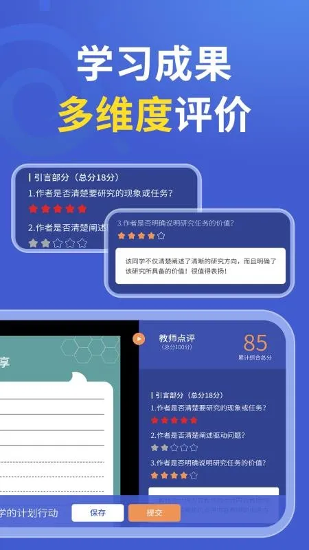3、教师可多维度评分和评价学生作业,学生能查看教师评分和评价,且可追溯、查看。此外,学生研究院统计学生完成课程的多维度数据,提供多种数据统计方式方便对比查看。