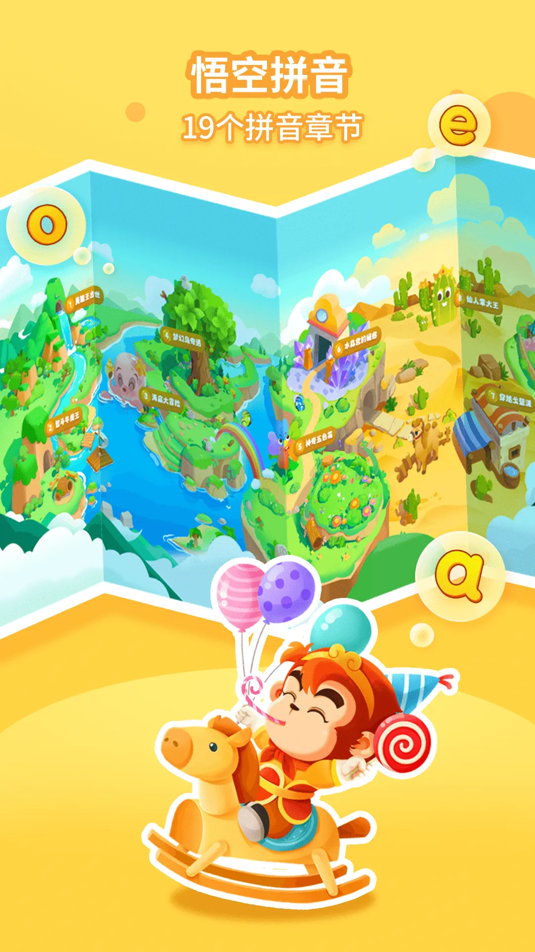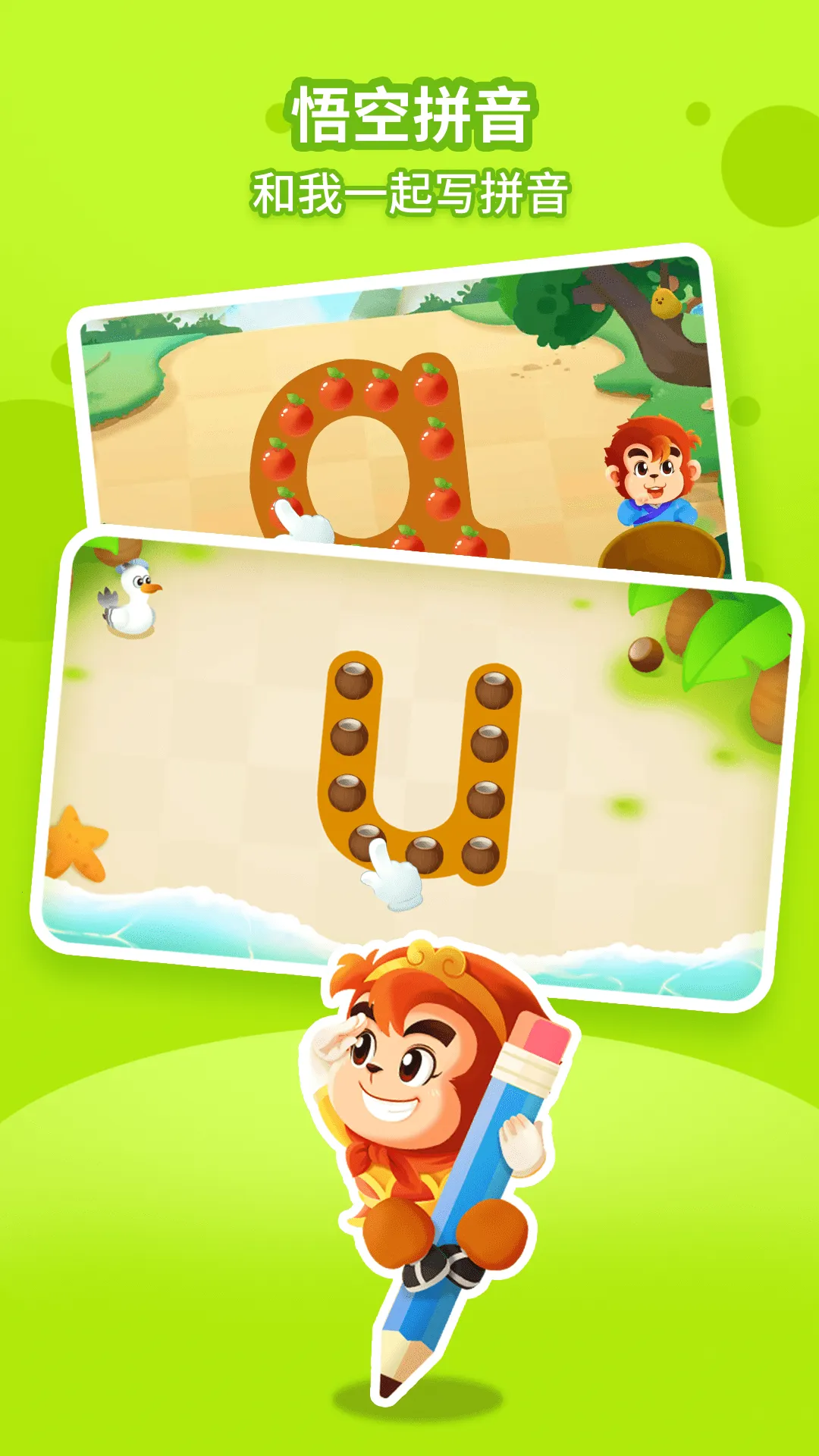 悟空拼音是启点教育为幼儿打造的拼音学习软件。以悟空学艺为背景,有14篇西游故事和42个趣味互动。孩子1个月内可掌握声韵母等,还能进行汉字、词语拼读练习,结合手写、语音识别,多平台同步学习。