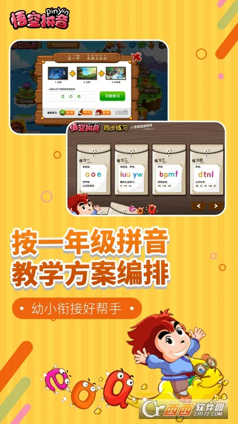 1、悟空拼音专为少儿打造,以卡通动画和精彩原创剧情展开学习,像悟空学艺、龙宫寻宝等故事,能极大吸引孩子兴趣,让孩子在趣味互动中认识并掌握更多汉语拼音。