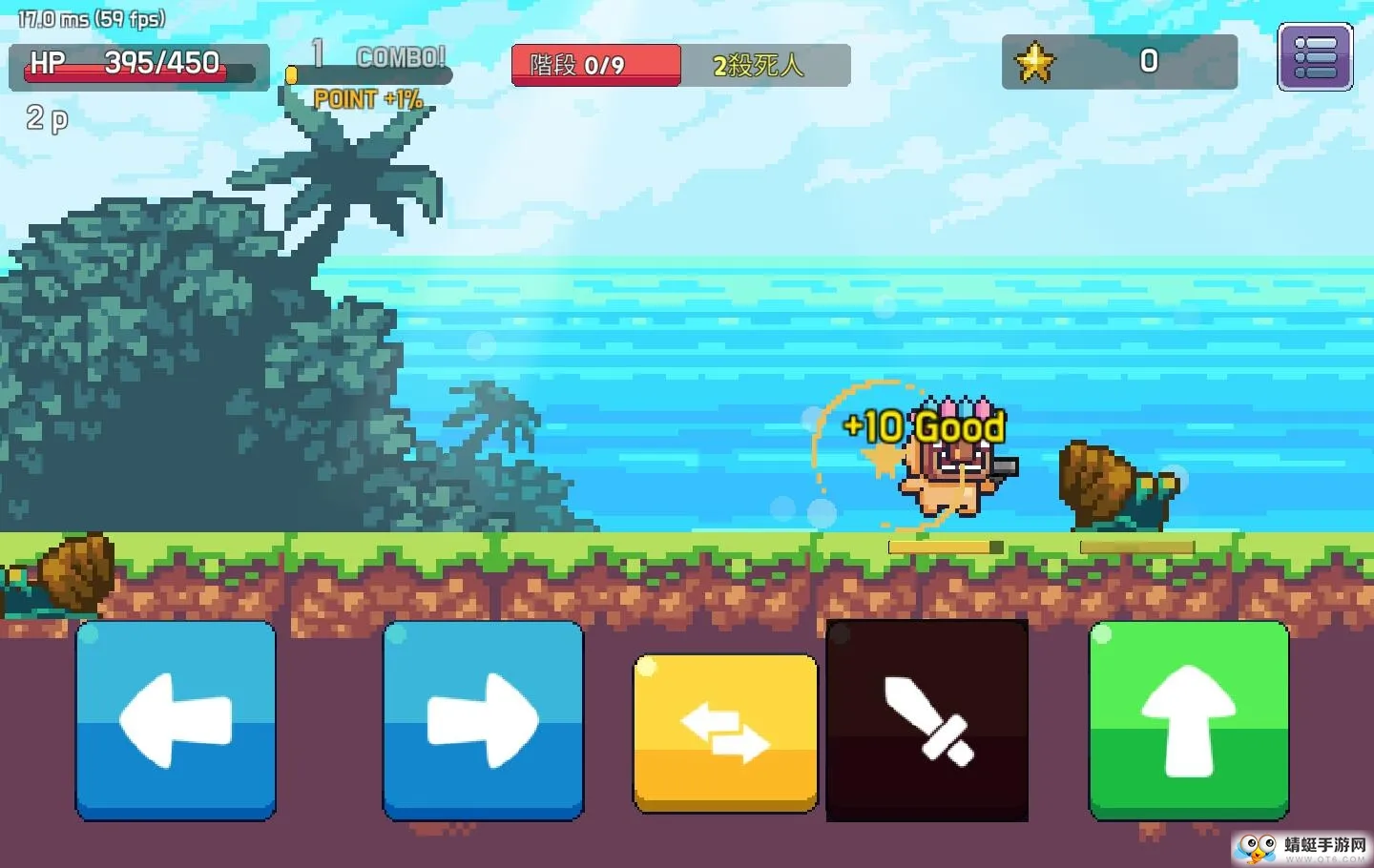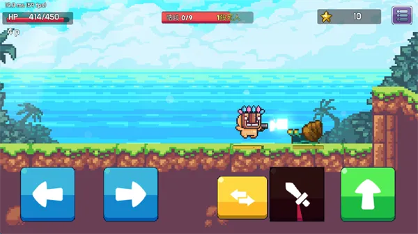 2、屏幕左侧的左右键位可以控制角色的移动方向,屏幕右侧可以控制角色的攻击,跳跃,以及武器的切换,游戏开始之初,角色会有近战和远程两个武器。