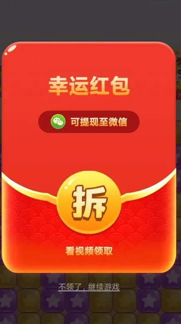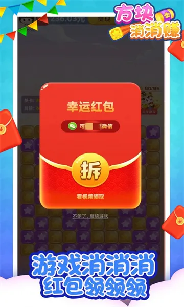 方块消消赚是一款超有趣的方块三消闯关游戏。它玩法丰富,能给你带来欢乐体验。传统三消模式通俗易上手,滑动就能创造连击闯关赚红包。这里关卡丰富,完成对应任务、达到目标分数就能领取关卡红包奖励。新手上线有新人红包和福利宝箱。游戏支持挂机,金币和红包都能到账。观看视频能领红包,看多少次领多少次。完成提现任务可获红包领取机会,每天每种金额都能直接拿。关卡还有气泡红包,邀请好友一起玩也能赚钱。而且每个方块有独特特效和音效,能让你感受全方位沉浸式体验,还能合并方块得高分。不管是在新手机还是旧手机上,只要能正常安装游戏,满足提现条件就能提现。在方块消消赚里,你可以尽情享受消除乐趣,轻松赚取红包,快来试试吧!
