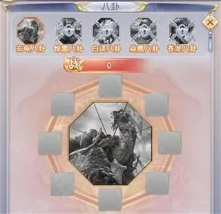 玩家的八卦根据飞升境界进行开启,依次为玄龟八卦、惊雷八卦、白泽八卦、炎凰八卦、苍龙八卦。八卦部位装备八卦牌之后即可使用强化石对不同部位进行强化,只有装备了八卦牌的部位才能进行强化,强化后增加的属性直接添加到主角人物身上。