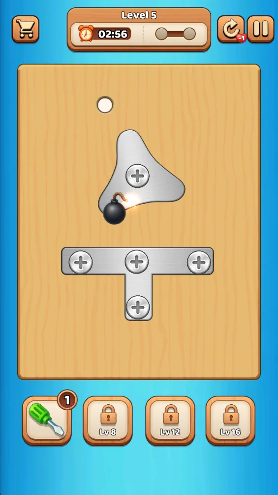3. 拥有渐进式难度设计,初期为单一平面螺丝群,后期引入双层交叠与隐藏螺丝机制,还有动态时间评分系统给予星级评价。