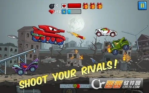 3. 面对坏蛋卡车疯狂来袭,需越过重重障碍,消灭敌人,尽可能多收集宝石,顺利到达终点。