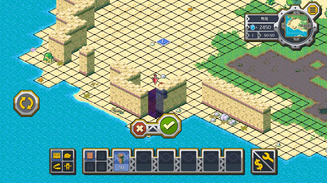 4、当剧情推进一定程度后会进入战斗模式,战斗时点击左下方可以切换放置的建筑,点击对应建筑后再次点击绿色对勾按钮可以放置建筑。