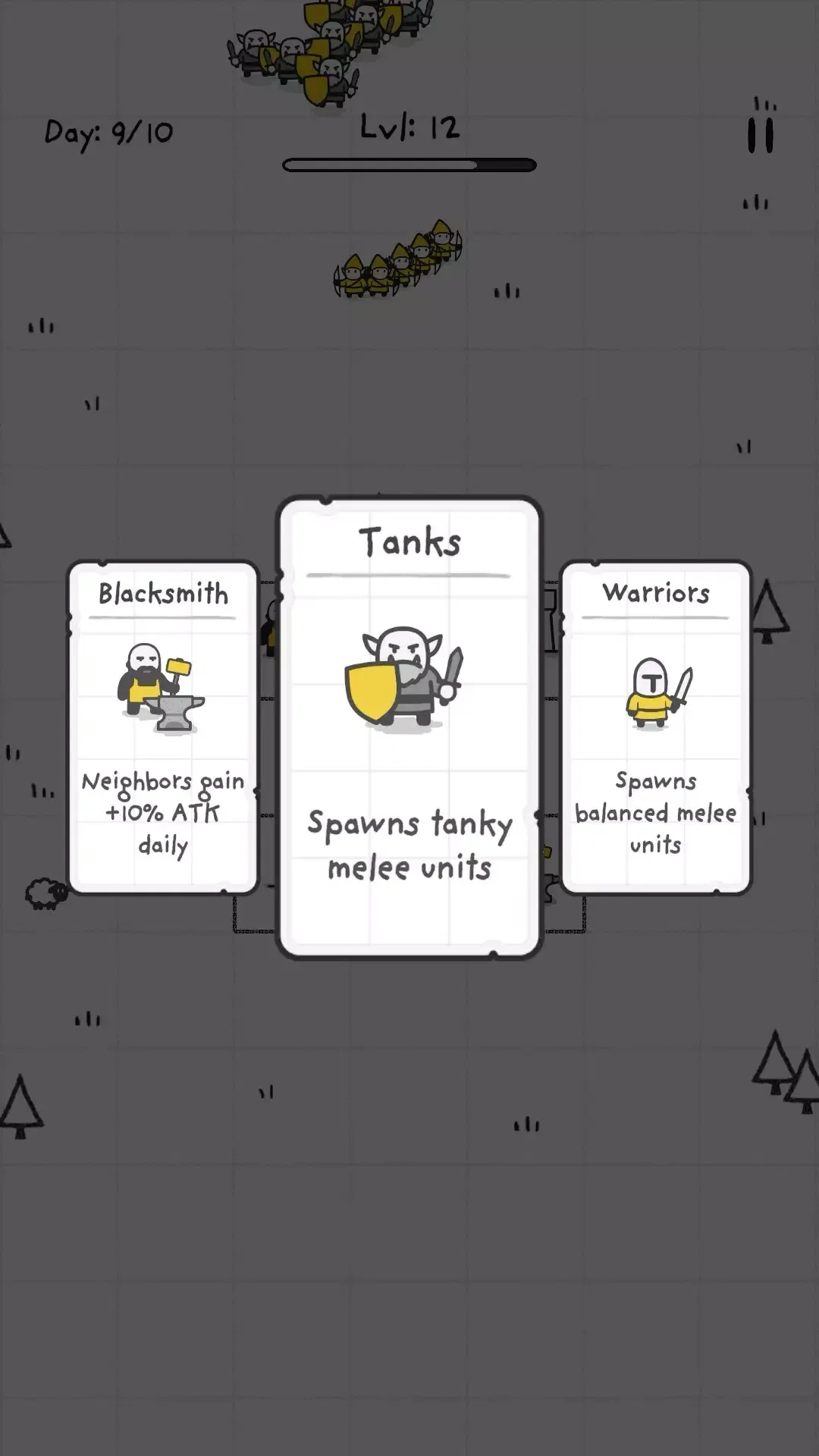 2、拥有独特的三选一升级系统,每波敌人过后从三张卡牌中选一张,强化现有单位或解锁新单位。
