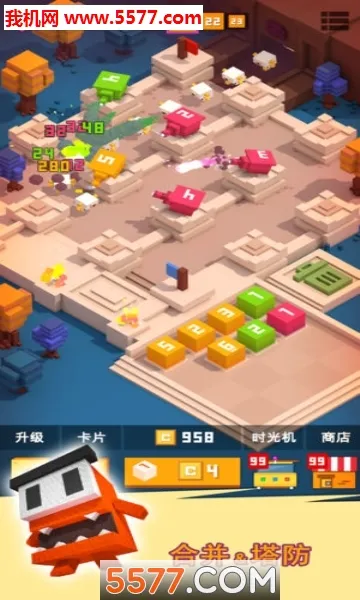 1. 数字合成机制融入塔防,两个相同数字与颜色的方块拖拽合并可生成更高等级炮台。
