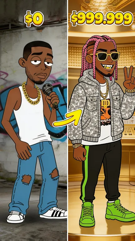 2、结合生活模拟与放置点击玩法,轻松操作中感受成长快感,打造独特说唱达人形象。