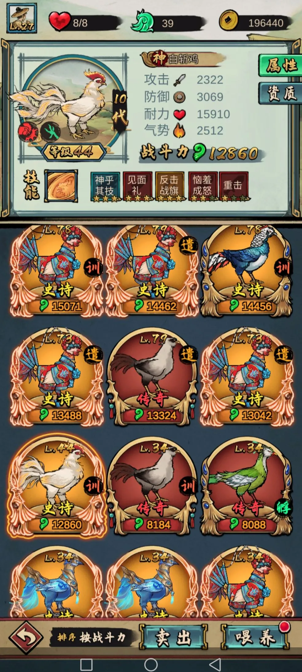 2、丰富斗鸡培育:有几十种不同的斗鸡等待培育,可抓捕斗鸡参加比赛,还能孵化新斗鸡,一代一代培育出最强斗鸡。且斗鸡有几十种不同技能,可探索最佳组合。